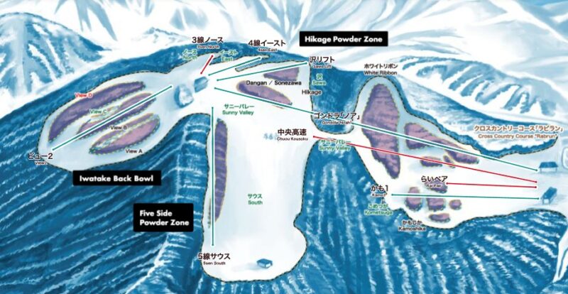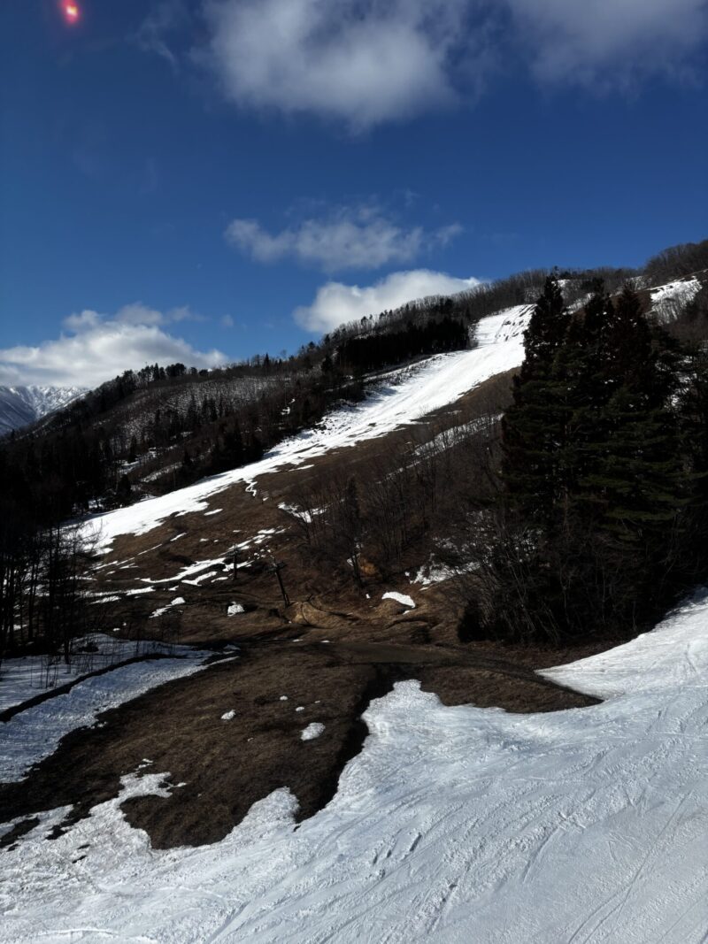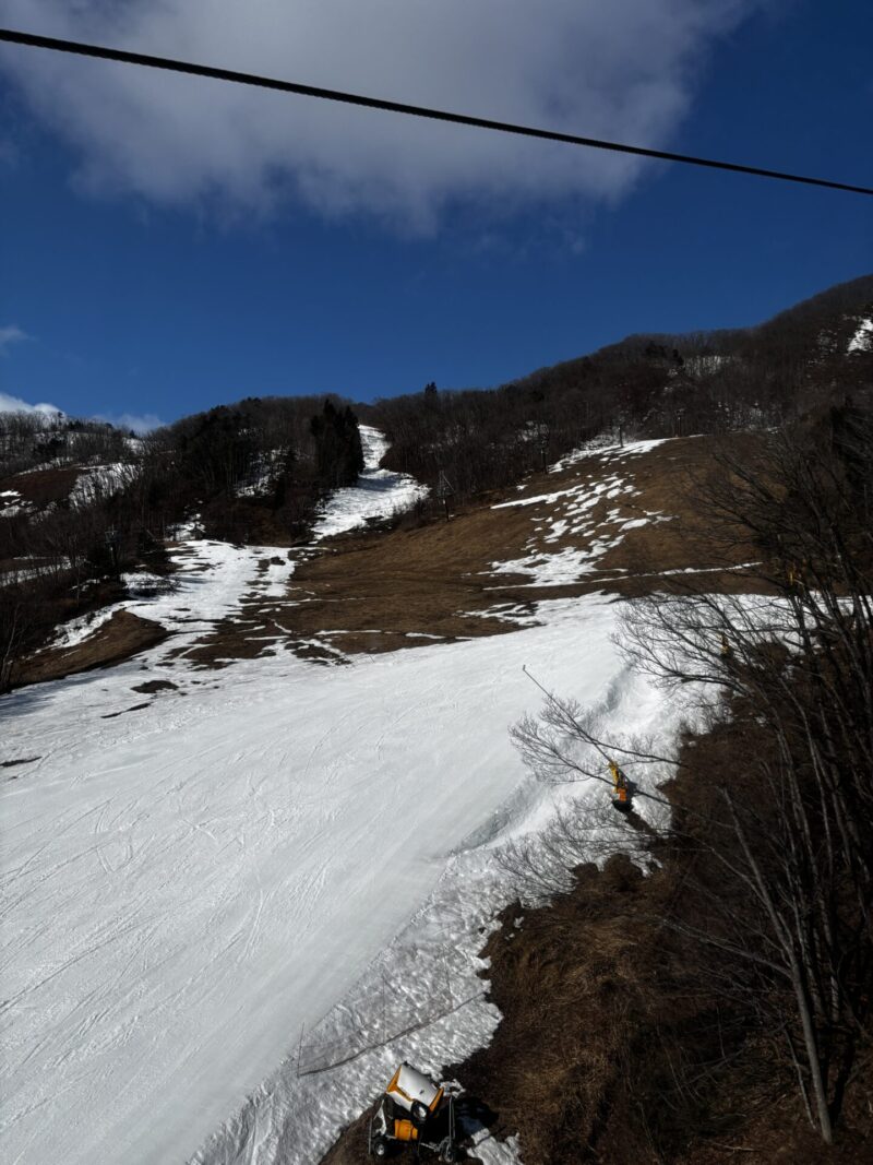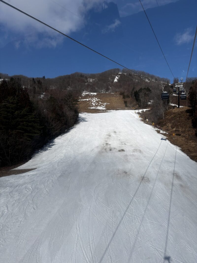 中腹は土・石の露出が激しく、避けながら滑るというレベル。新しい板の方はゴンドラ下山がオススメです。